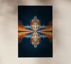 Scoprite lo splendore luminoso di Versailles in una notte stellata. Le perfette simmetrie e le scintillanti illuminazioni catturate in questa immagine evocano un'atmosfera fiabesca e un omaggio all'arte e alla grandiosa architettura della tenuta.