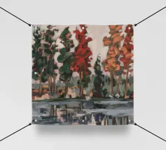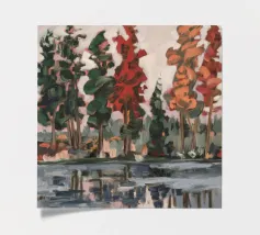 Gli alberi cremisi si riflettono nelle acque dolci, catturando un momento tranquillo di comunità stagionale.