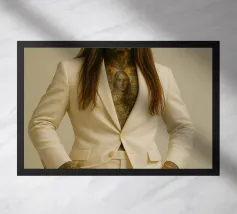 Rafe attraversa Londra come un segreto mal custodito. Non parla, ma misura. Nei vernissage illuminati di grigio, il suo abito d'avorio spicca come una minaccia lucida. Sul petto, un santo tatuato dice a tutti che lui tace. Non cerca la luce. È la tensione che la precede.