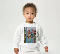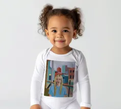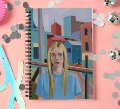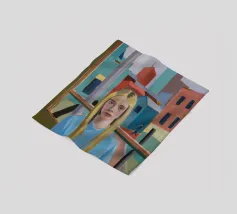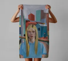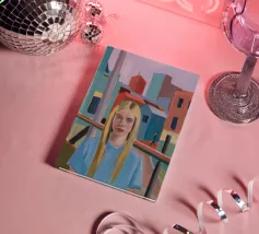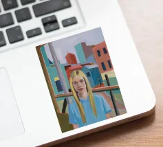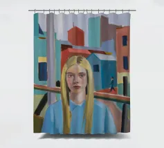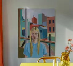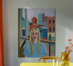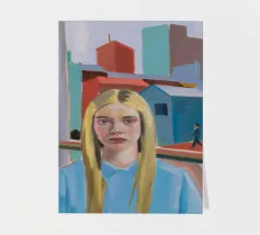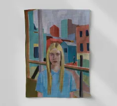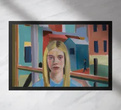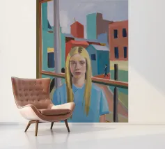 Una ragazza bionda si affaccia a un balcone con alle spalle edifici urbani astratti, con un'espressione calma e distante.