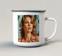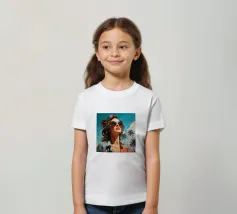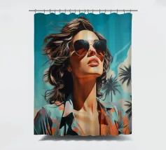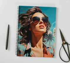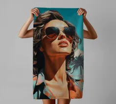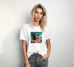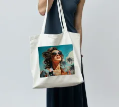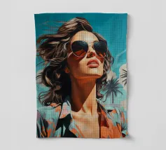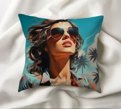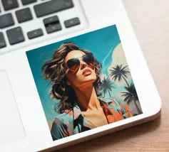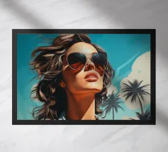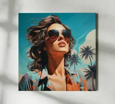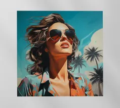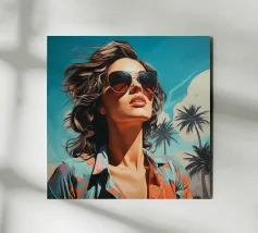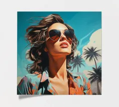 La "Palm Springs Girl" con occhiali da sole incarna il vivace stile di vita californiano con un affascinante design retro-vintage, mentre le palme lussureggianti e il cielo luminoso creano uno sfondo solare per la protagonista sicura di sé.