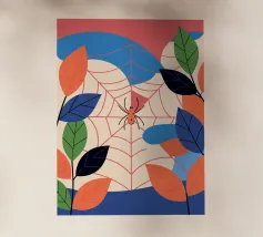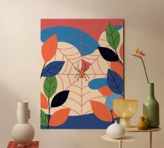 Godetevi una colorata illustrazione naturalistica con un ragno nella sua ragnatela circondato da foglie. Con colori vivaci e un design unico, questa opera d'arte porterà un tocco di natura e di stile artistico al vostro spazio.