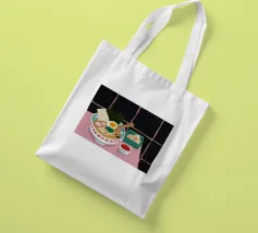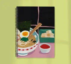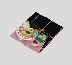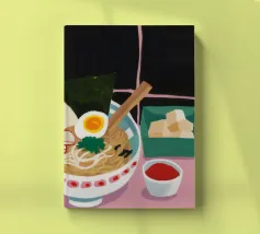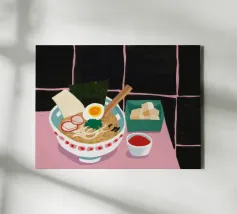 Una tranquilla ciotola di ramen con tofu, uova e brodo si trova in un ambiente nero e rosa.