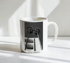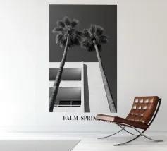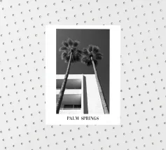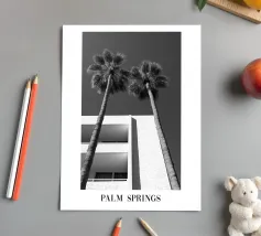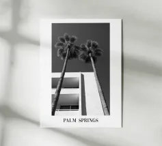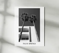 Questo poster di viaggio minimalista di Palm Springs cattura il fascino retrò della California con le sue iconiche palme e gli edifici di metà secolo. L'armoniosa combinazione di cemento e natura trasforma qualsiasi appartamento in un'oasi estiva.