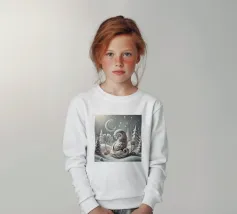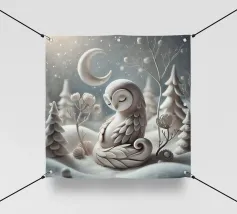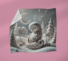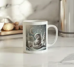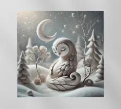Un gufo Twiglet, con morbide piume bianche che ricordano delicati ramoscelli, se ne sta tranquillo in una foresta coperta di neve. L'aspetto etereo e quasi magico del gufo si fonde perfettamente con il paesaggio invernale, mentre i fiocchi di neve scivolano dolcemente intorno a lui. La luna, che risplende luminosa, proietta una luce morbida e argentea sulla scena, illuminando il gufo e gli alberi innevati. Nonostante il cielo notturno, la scena è pervasa da una pacifica luminosità, creando un'atmosfera serena e onirica nel cuore della foresta. Una perfetta cattura della tranquilla bellezza della natura al chiaro di luna".
