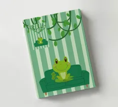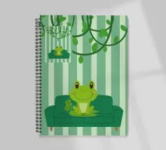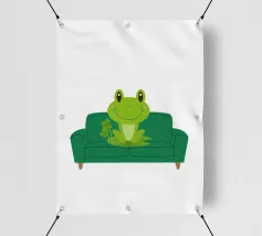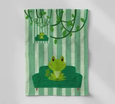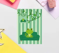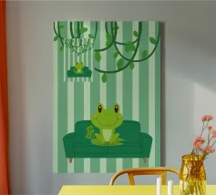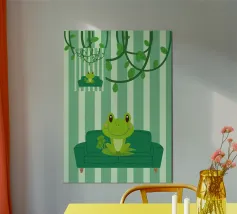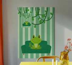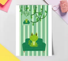 Poster Rana sul divano! Questa rana felice e rilassata si sta godendo un momento di riposo su un elegante divano verde sotto i rampicanti della giungla. Un'illustrazione meravigliosamente stravagante e carina, perfetta per una nursery moderna, una camera da letto per bambini o anche per uno spazio abitativo stravagante. Il tema della giungla/natura e i toni verdi brillanti conferiscono un'atmosfera allegra e tropicale. Un disegno perfetto per chi apprezza l'umorismo animale e l'arte murale di stile!
