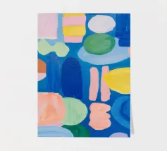 Una serena composizione astratta dominata da blu freddi e accenni di giallo e rosa. Le forme fluide e la tavolozza armoniosa creano un senso di calma e tranquillità, ricordando una scena subacquea o un cielo sereno.
