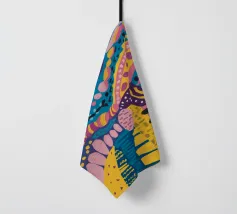 Un motivo astratto dinamico e intricato, dominato da gialli dorati e blu profondi, con linee fluide e forme organiche. La complessità del labirinto e i colori vibranti creano un senso di movimento energetico e di profondità visiva.