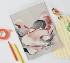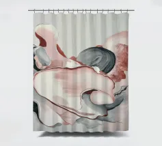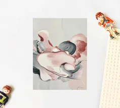 Un'opera d'arte astratta sensuale con toni morbidi e sfumati di rosa e grigio, che evocano forme organiche, simili a petali o corporee in una composizione delicata e avvolgente.