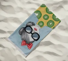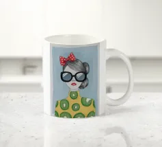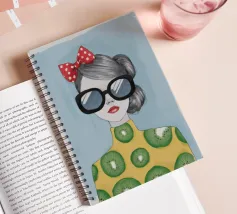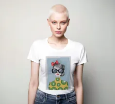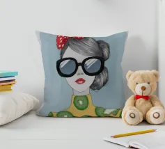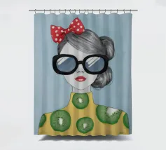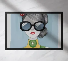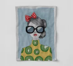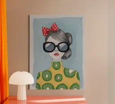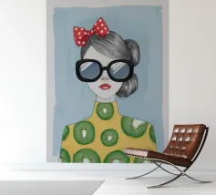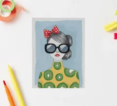 Un elegante ritratto di ispirazione rétro di una donna con i capelli raccolti in uno chignon, ornato da un grande fiocco rosso. Indossa occhiali da sole alla moda e un top a pois gialli, che emanano un'atmosfera vintage giocosa e chic.