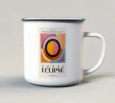Una brillante fusione di geometria Bauhaus e design di metà secolo: con il titolo "ECLIPSE", l'artista presenta una rappresentazione minimalista ma profonda dell'evento cosmico. La figura centrale - un occhio o un sole eclissato - è strutturata da una squisita palette cromatica di arancione, rosso e giallo senape, che crea un'estetica calda e nostalgica. I toni tenui e semicircolari in alto a sinistra rompono la simmetria in modo sottile ma deciso. La chiara riduzione grafica e l'iconica tipografia rendono l'opera un capolavoro senza tempo.