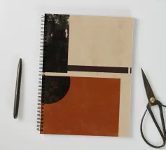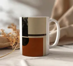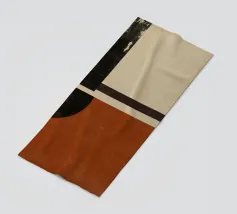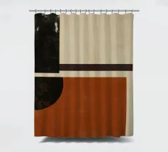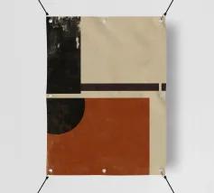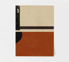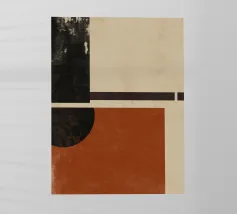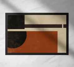 Un'opera d'arte astratta di ispirazione moderna di metà secolo, caratterizzata da cerchi e rettangoli stratificati nei colori rosso ruggine, nero e beige. Il suo stile nostalgico la rende un pezzo ideale per interni retrò o spazi moderni con un tocco vintage.