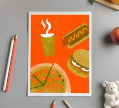 Riportate alla mente i ricordi dei fast food iconici con un tocco retro pop unico! Il design colorato e dettagliato presenta i piatti classici dei fast food in un moderno ed emozionante stile retro pop.