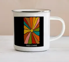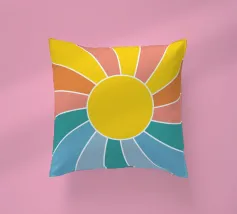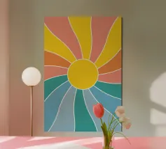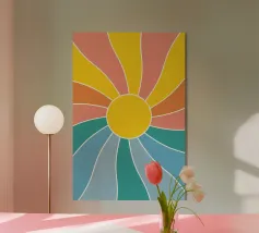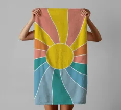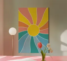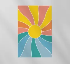 Un motivo radioso e simmetrico con un centro giallo solare da cui partono raggi curvi e ondulati in tonalità calde e fredde: Giallo, pesca, arancio, turchese, azzurro e blu. La disposizione armoniosa e il morbido gradiente di colore creano movimento ed equilibrio allo stesso tempo, come un gioco visivo di luce ed energia.