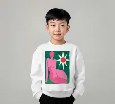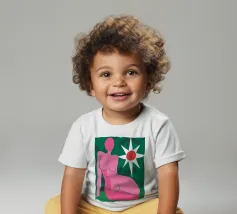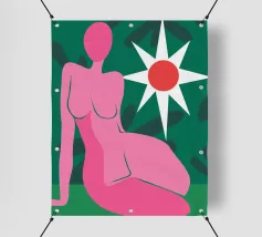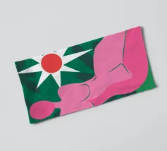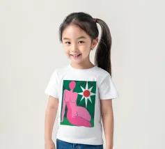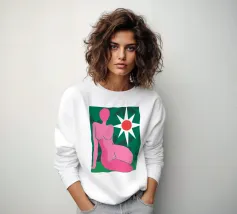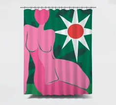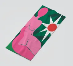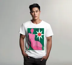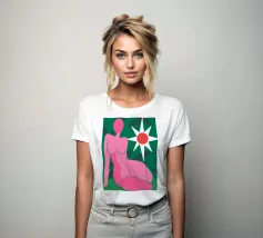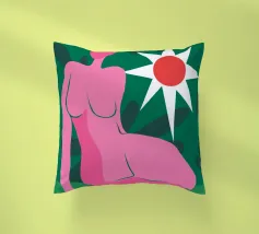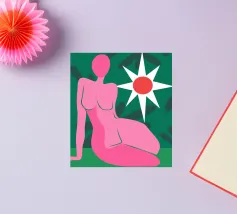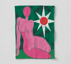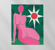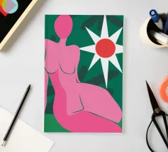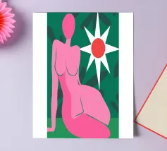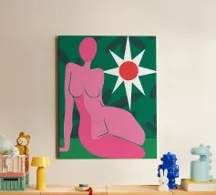 "Pink Reverie" è un'opera d'arte minimalista con una figura astratta di colore rosa su un audace sfondo verde, illuminata da un sereno sole bianco. Questo pezzo sorprendente unisce eleganza e semplicità, perfetto per gli spazi moderni.