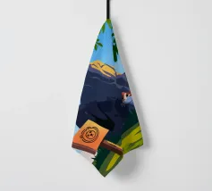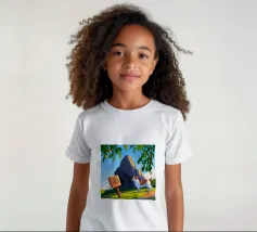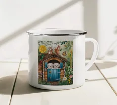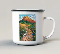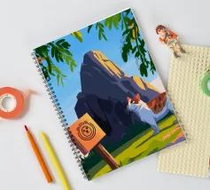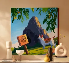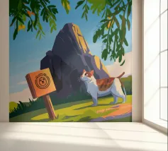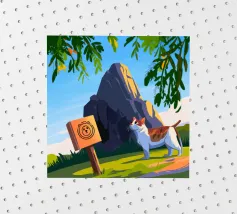 Un cane e un gatto si trovano alla base di una montagna e osservano un cartello. Il paesaggio roccioso e il verde segnano l'inizio della loro avventurosa escursione.