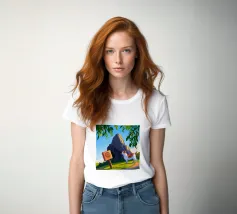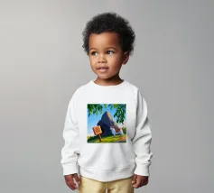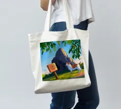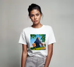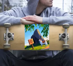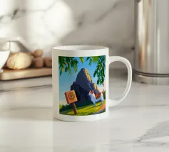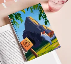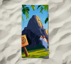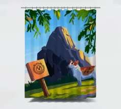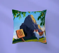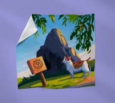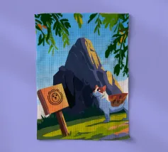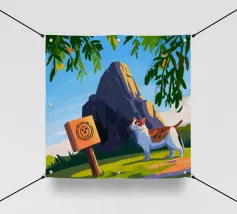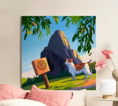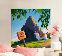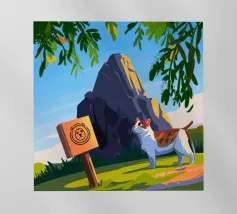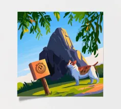 Un cane e un gatto si trovano alla base di una montagna e osservano un cartello. Il paesaggio roccioso e il verde segnano l'inizio della loro avventurosa escursione.