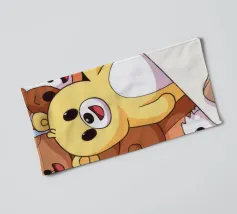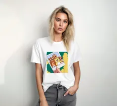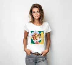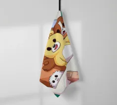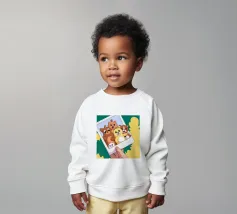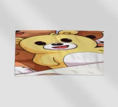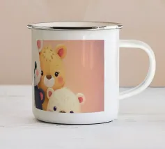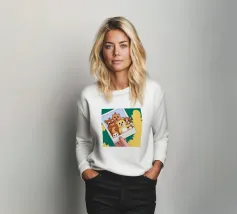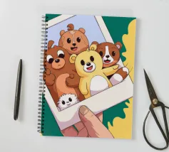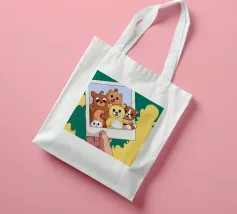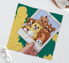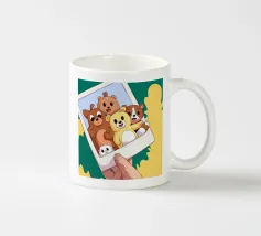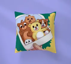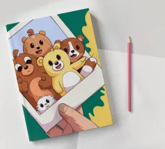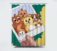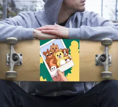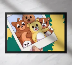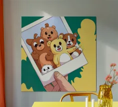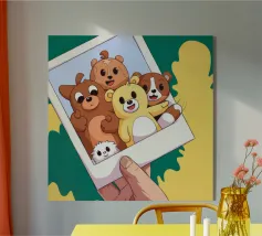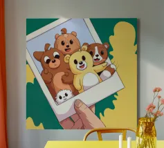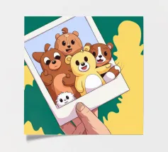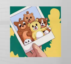 Una mano regge una Polaroid di orsi e cani di peluche su uno sfondo verdeggiante con soffici nuvole. L'immagine nostalgica evoca gioia e momenti preziosi congelati nel tempo.