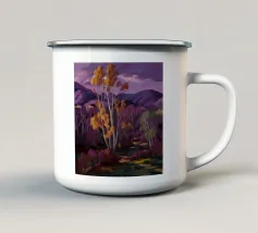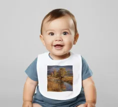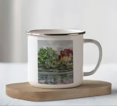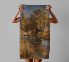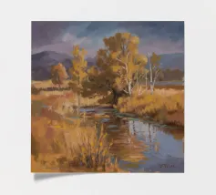 Un dipinto paesaggistico di un fiume o di un torrente in autunno, con il fogliame dorato e arancione degli alberi lungo le sue rive. L'acqua riflette i colori degli alberi e del cielo. Lo stile è morbido e d'atmosfera.