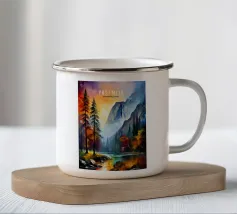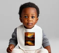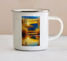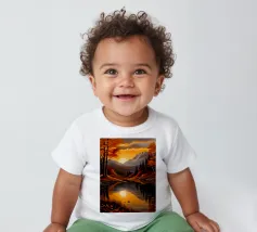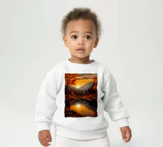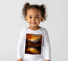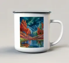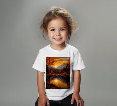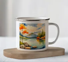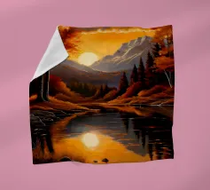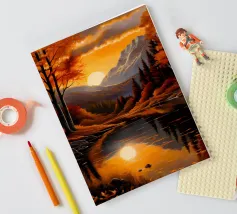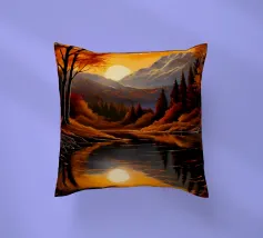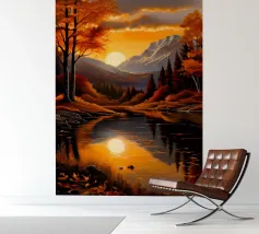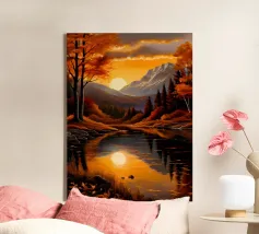 Un dipinto di paesaggio autunnale mozzafiato con un lago sereno che riflette un vibrante tramonto. La scena è incorniciata da maestose montagne e fogliame colorato, che creano un senso di pace e tranquillità.