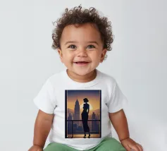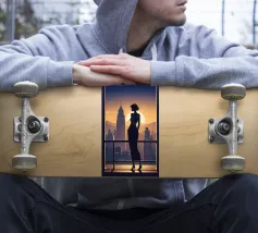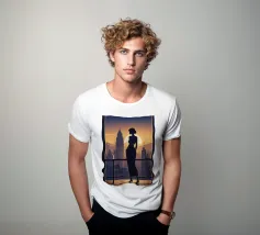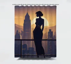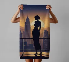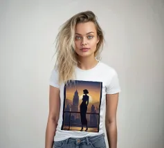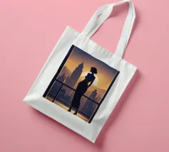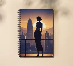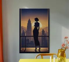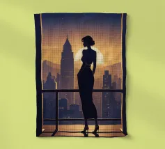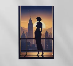 Una graziosa silhouette di donna che si affaccia su uno skyline cittadino luminoso, mentre il sole tramonta dietro i grattacieli. Il minimalismo elegante incontra la luce soffusa della sera, creando un'atmosfera urbana ma poetica.