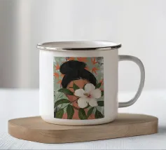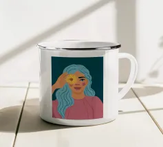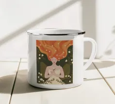 Una persona con lunghi capelli rossi è raffigurata con un occhio tatuato sul braccio, circondato da grandi foglie e fiori, che suggeriscono un senso di mistero e introspezione.