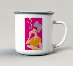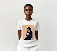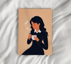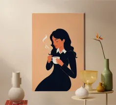 Una morbida illustrazione minimalista di una donna che si gode una calda tazza di caffè. Le linee pulite e i toni caldi creano un momento di calma ideale per camere da letto, studi e accoglienti angoli di lettura.