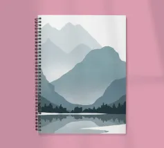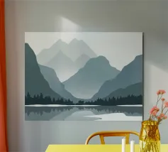 Un paesaggio sereno è caratterizzato da una serie di montagne in varie tonalità di blu e grigio, che si riflettono in uno specchio d'acqua calmo. Alberi sagomati costeggiano la riva del lago, aggiungendo profondità alla scena tranquilla.