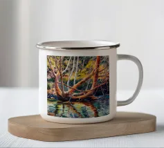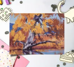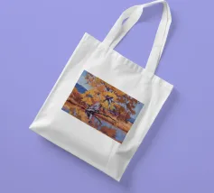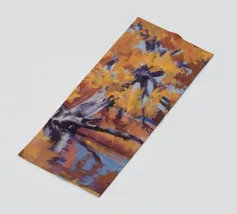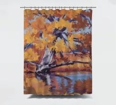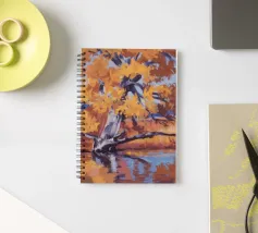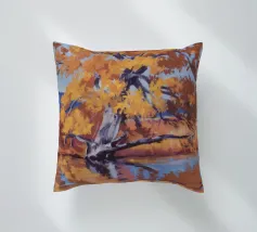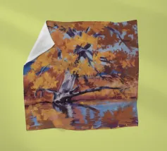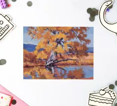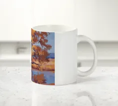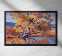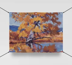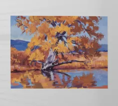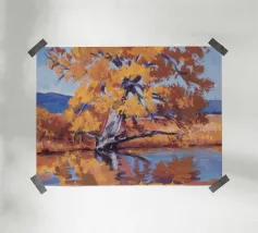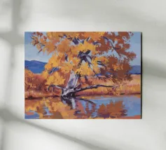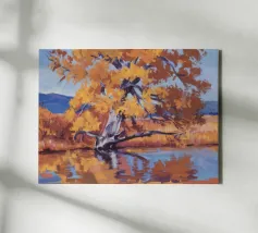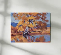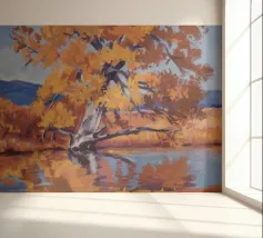 Un sereno paesaggio autunnale dominato da grandi alberi dal fogliame giallo-arancio brillante, le cui forme si specchiano perfettamente nelle acque calme di un fiume o di un lago, sotto un cielo morbido e vaporoso.