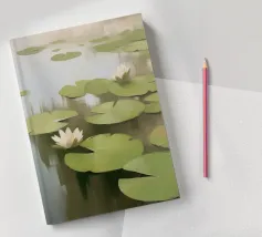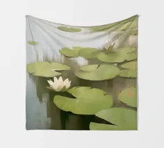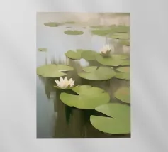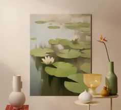 Questo elegante dipinto a olio mostra romantiche ninfee in morbide tonalità verde pastello che si riflettono nell'acqua, catturando la bellezza della natura in un lago armonioso.