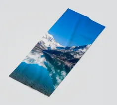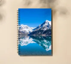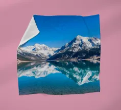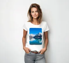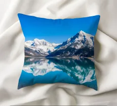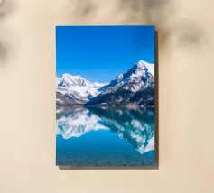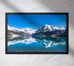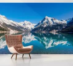 Un cielo azzurro e limpido si riflette perfettamente in un lago sereno circondato da maestose montagne innevate. Questa splendida scena cattura l'essenza della bellezza e della tranquillità della natura.