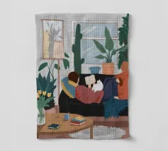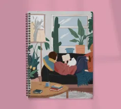 Una scena accogliente di una donna che legge sul divano tra cactus e decorazioni morbide nella luce del pomeriggio.