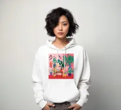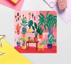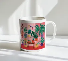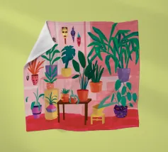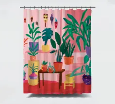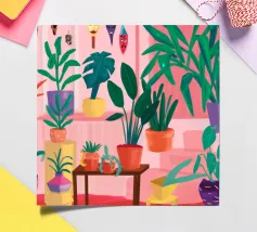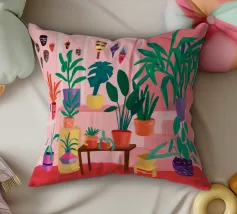 Un'accogliente scena d'interni ritrae una stanza piena di numerose piante in vaso di vario tipo, un tappeto a fantasia e un tavolino, creando un'atmosfera calda, bohémien e amante delle piante con una parete rosa-arancio.