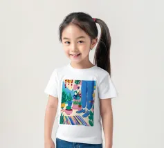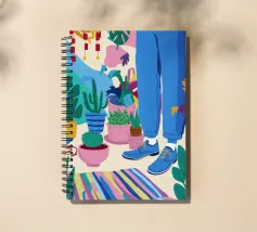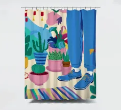 Un'illustrazione di una stanza vivace e in stile bohémien è assolutamente piena di una collezione di piante in vaso e cactus su un tappeto a righe colorate, creando un rifugio perfetto per un amante delle piante.