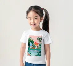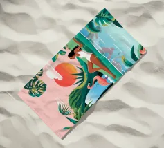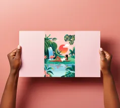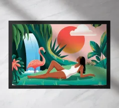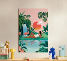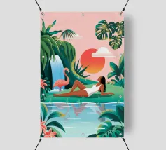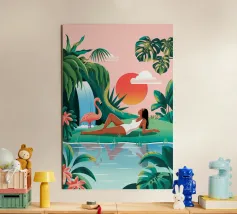 Una donna riposa vicino a una cascata in un vivace ambiente tropicale. Le palme, i fiori radiosi e il tramonto luminoso creano un santuario mozzafiato.