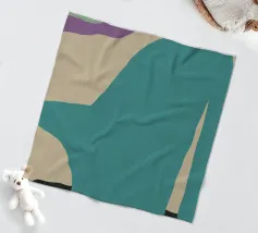 Un mix di forme e colori forma un disegno astratto con una forma dominante di colore blu acqua al centro. La composizione presenta aree di colore piatte e decise e i bordi tra le forme sono netti e ben definiti.