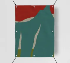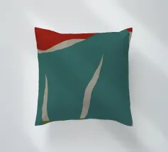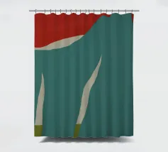 Una grafica in stile minimalista mette in mostra forme astratte con un rosso deciso nella parte superiore e varie tonalità di turchese e verde nel resto della composizione. Le forme curve e appuntite ricordano un paesaggio stilizzato o motivi vegetali, evocando un senso di semplicità e design moderno.