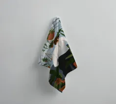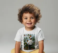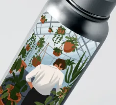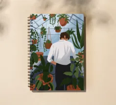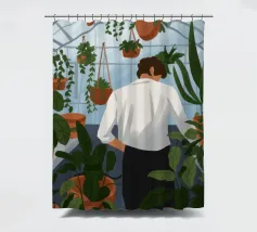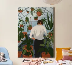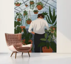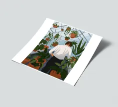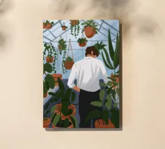 Questa opera d'arte mostra una persona che ammira file di piante in vaso in una serra. Lo spazio luminoso e organizzato enfatizza la bellezza del verde vivace.