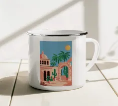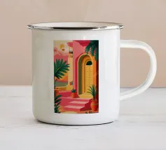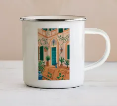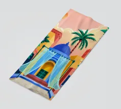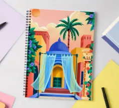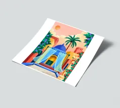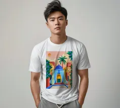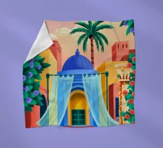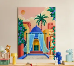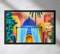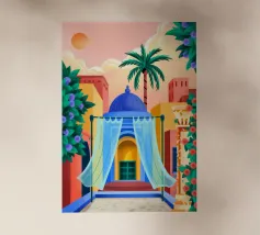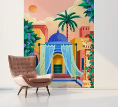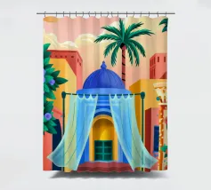 Un cortile con una struttura a cupola blu è ornato da tende fluenti e da una vegetazione lussureggiante. L'atmosfera invitante fonde l'eleganza architettonica con la tranquillità naturale.
