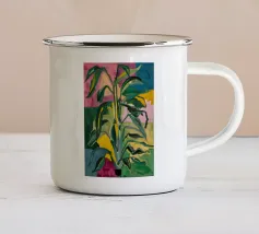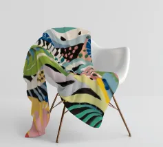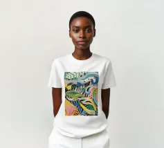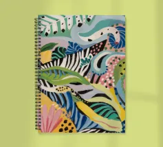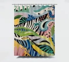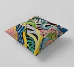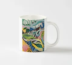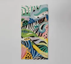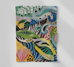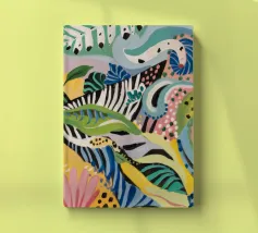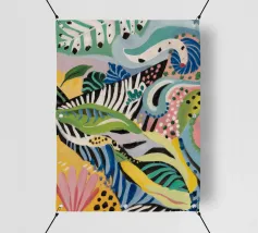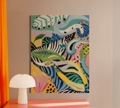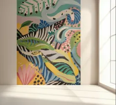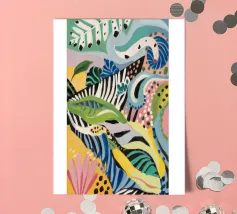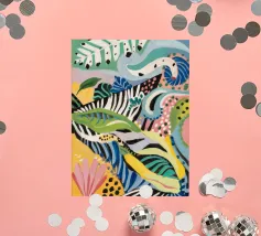 Una composizione stilizzata e ritmica di foglie tropicali ornate da diversi motivi come strisce e punti, in una tavolozza di verdi, gialli, blu, rosa e audaci strisce zebrate bianche e nere.