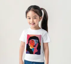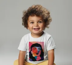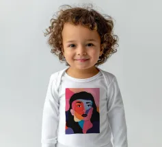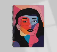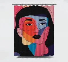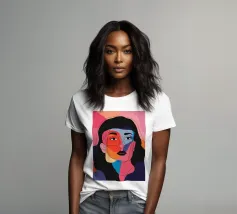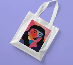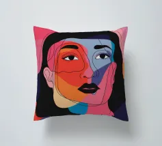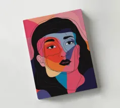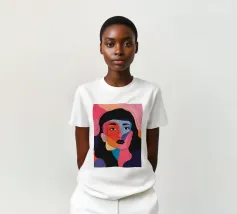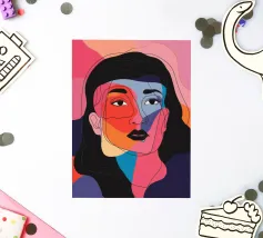 Un ritratto astratto di un volto costruito da forme frammentate e sovrapposte di colore rosa, rosso, blu e arancione che creano un'immagine potente, emotiva e moderna.