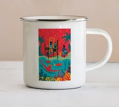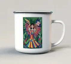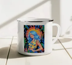 Questa opera d'arte mostra una figura con capelli blu circondata da intricati motivi caleidoscopici dai colori intensi. Lo sfondo è pieno di forme geometriche e disegni vivaci.