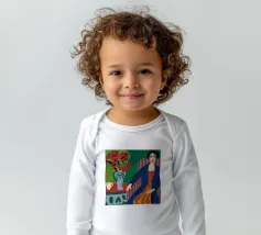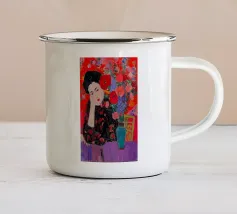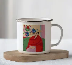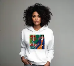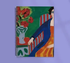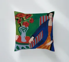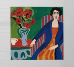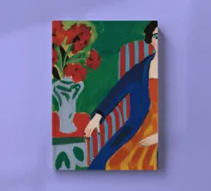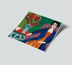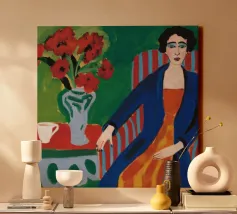 Un elegante ritratto di donna con fiori rossi, che indossa un'audace giacca blu e un abito giallo a fantasia. Il blocco di colori e lo sguardo sicuro creano una dichiarazione artistica potente e moderna.