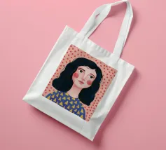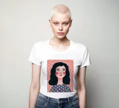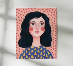 Un ritratto caldo e gentile di una donna con i capelli scuri e un top blu a fantasia, su uno sfondo rosa tenue e strutturato. Il suo lieve sorriso crea un'atmosfera invitante e gentile.