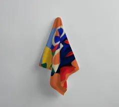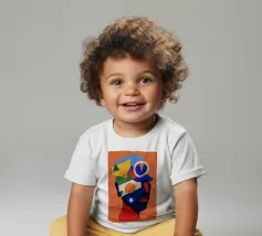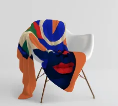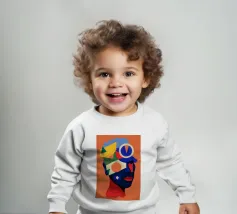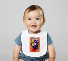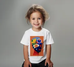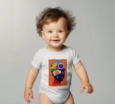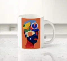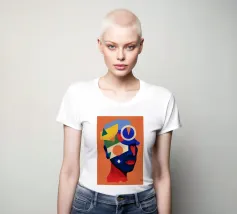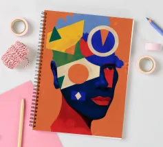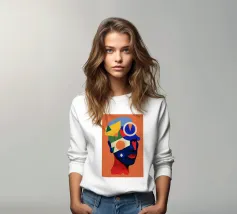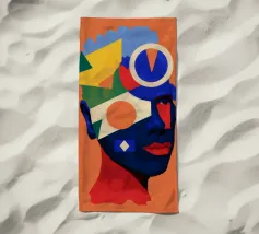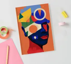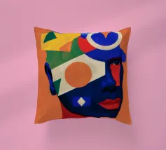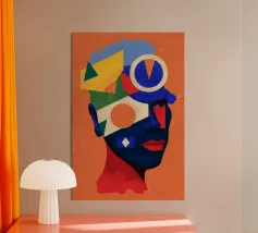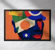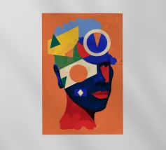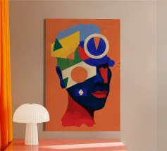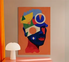 Un ritratto astratto di un volto reso in stile cubista, utilizzando forme geometriche audaci e una tavolozza di colori vibranti di blu, arancioni, gialli e rossi.