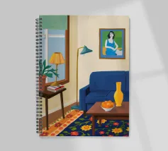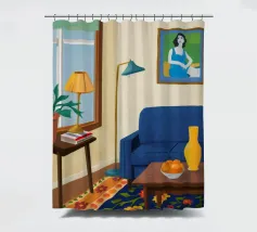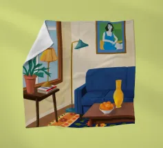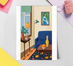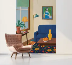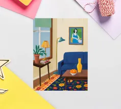 Una scena d'interni con un divano blu, un tappeto a fantasia e un tavolino con una lampada. Un ritratto di donna appeso alla parete aggiunge un tocco personale a questo spazio abitativo elegante, accogliente e contemporaneo.