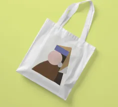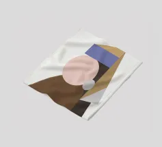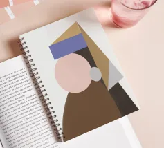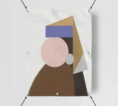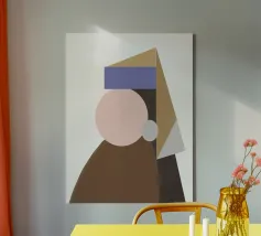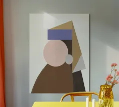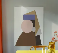 Una composizione geometrica presenta una serie di forme colorate e sovrapposte che sembrano formare un ritratto astratto. Cerchi e triangoli nei toni tenui del marrone, del blu e del beige creano un design minimalista.
