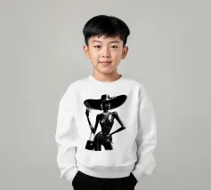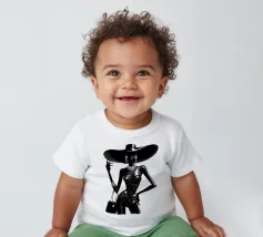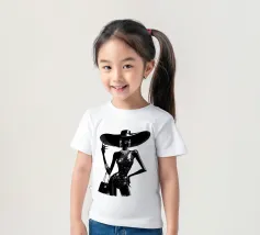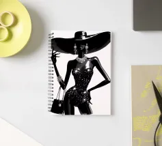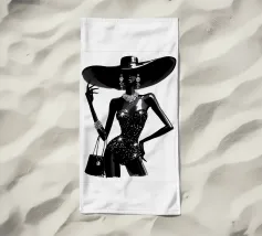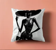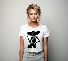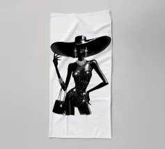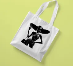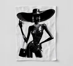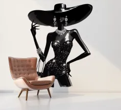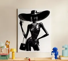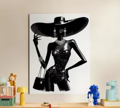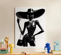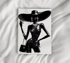 Illustrazione di moda di donna con cappello a tesa larga, utilizzando inchiostro acrilico nero.