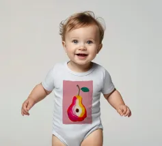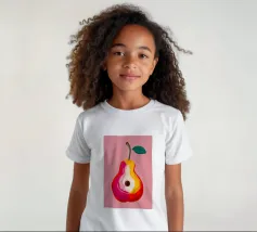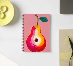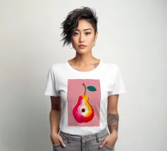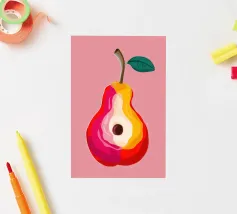 Una splendida illustrazione stilizzata di una singola pera, dipinta con vibranti sfumature di giallo, rosa e rosso. Il pezzo eleva il semplice frutto in un'opera d'arte colorata.