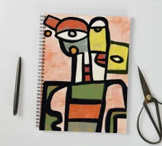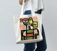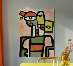 Una vibrante rappresentazione astratta di una figura composta da varie forme geometriche e colori domina la composizione. Linee decise delineano varie forme, dando vita a una sagoma umana stilizzata che include occhi e altri tratti del viso.